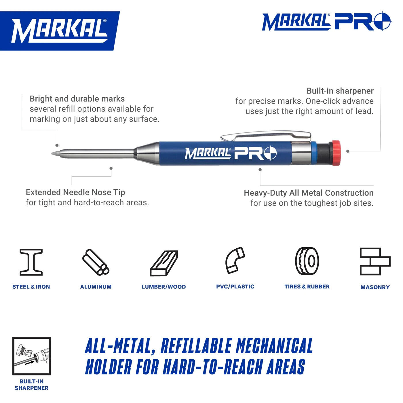-. Perfect for marking through holes or in other tight areas, the Markal Pro Holder uses a long needle-nose tip to mark in hard-to-reach spots.